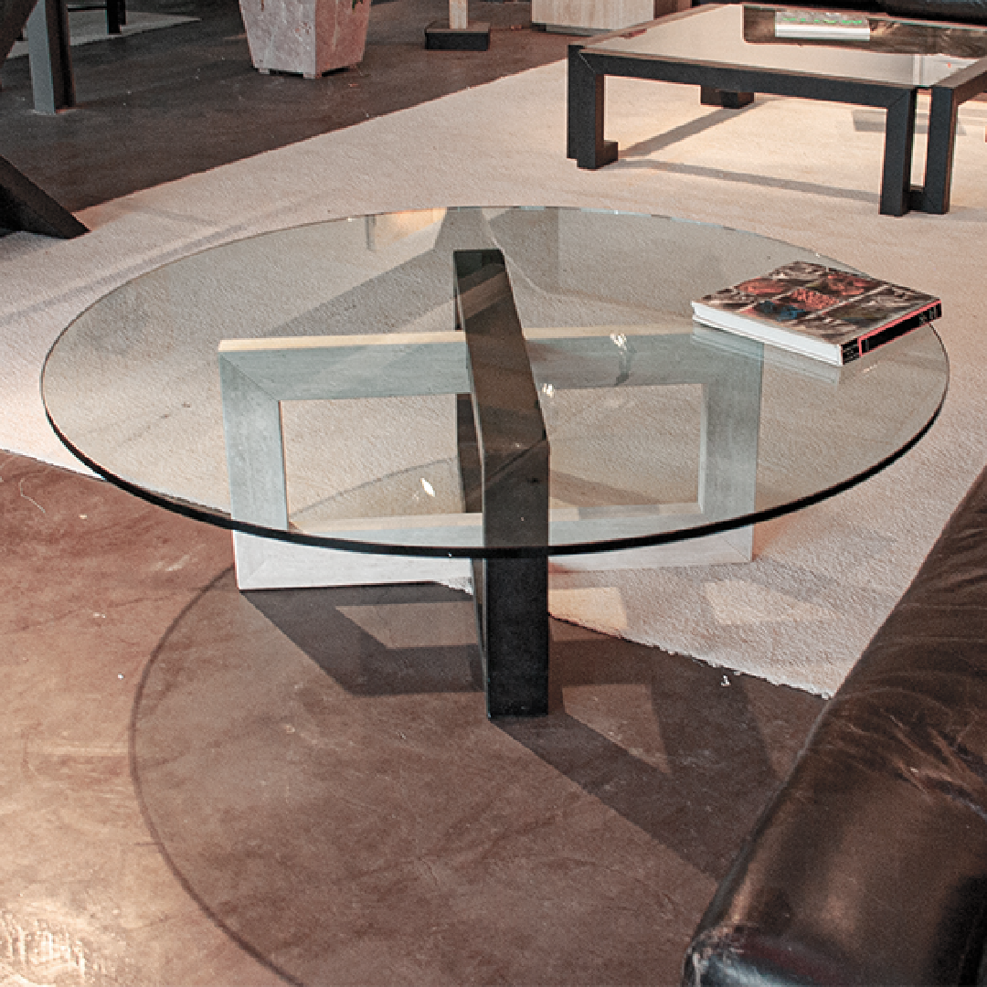 Se presenta con cristal redondo aunque es posible ponerle también un cristal cuadrado a la misma base estructura. La mesa de centro Lama de Moll está diseñada para soportar de igual forma un cristal redondo o uno cuadrado.